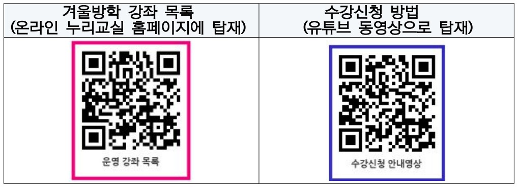 □ 강좌 운영 기간: 2024. 1. 2.(화) ~2024. 2. 13.(화) □ 수강 신청 기간: 2023.12.20.(수)10:00~ 12. 27.(수) 17:00 □ 강좌별 수강인원: 최소 5명~15명 □ 운영 대상: 수강을 희망하는 모든 초·중·고등학생 □ 신청 방법: 네이버 웨일 로그인→누리교실 로그인→수강신청(희망학생 개별신청) □ 신청 강좌 개설 확인: 2023.12.29.(금)11:00~ 누리교실센터 내신청조회 에서 확인가능 □ 유의사항 - 수강 신청 학생수가 저조할 경우 해당 강좌가 개설되지 않을 수 있으니, 양해바랍니다. - 1인당 신청 강좌 수 제한은 없지만, 다른 친구들을 위해 꼭 필요한 강좌만 신청해주세요. (수강료는 없음) - 수업에 결석할 경우에는 강좌를 운영하는 선생님께 미리 연락을 주세요. - 강좌 개설이후 학생이 4명이하(1명~4명) 수강하는 해당 차시의 경우 강의 진행이 불가할 수 있으니, 신청한 강좌를 빠짐없이 수강할수 있도록 해 주세요. □ 겨울방학 강좌 및 수강신청 방법